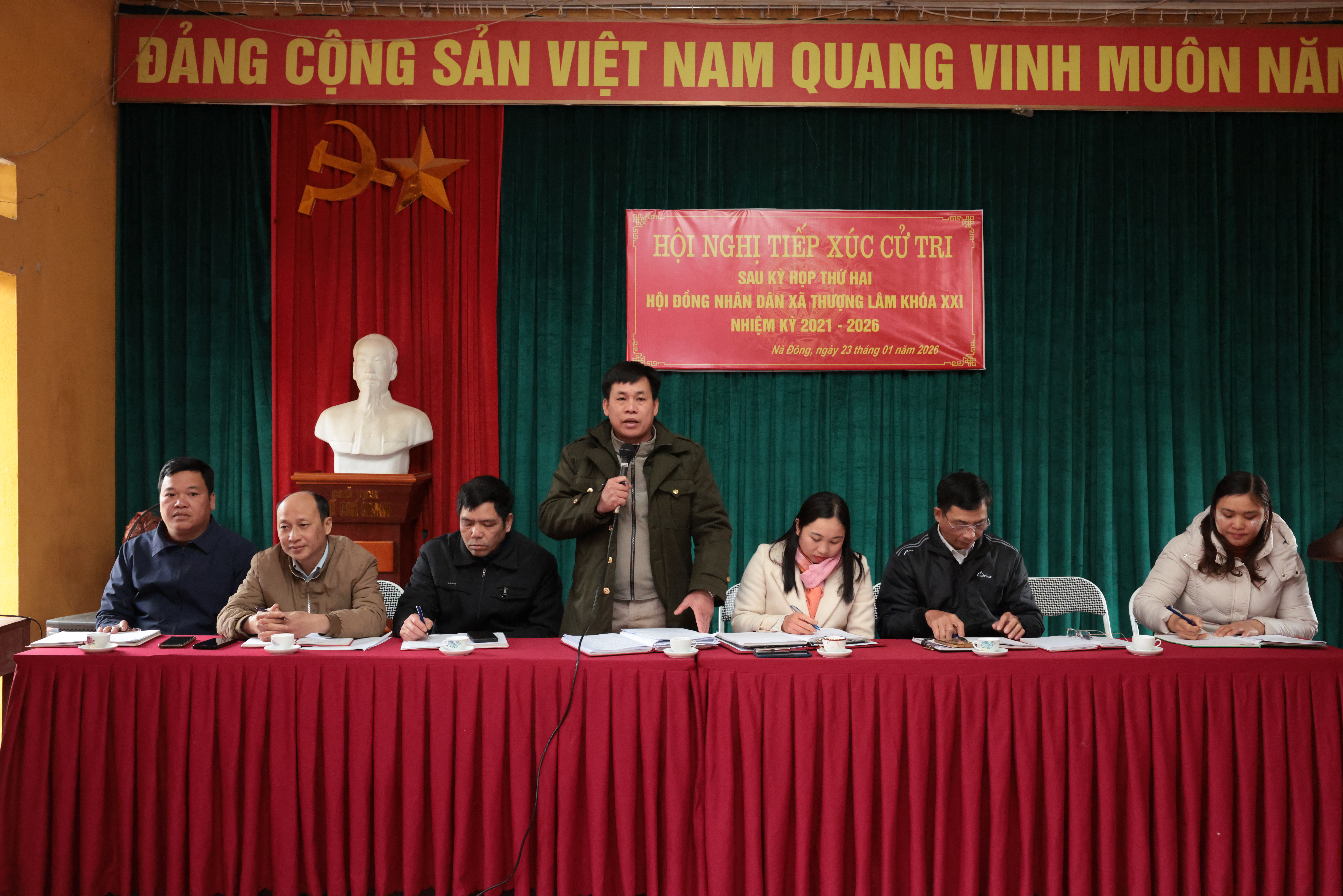 Chiều 23/1/2026, Tổ Đại biểu số 4 HĐND xã, Khóa XXI, nhiệm kỳ 2021-2026 xã Thượng Lâm gồm các ông bà: Vi Thị Nụ, Uỷ viên Ban Chấp hành Đảng bộ xã, Phó Chủ tịch HĐND xã; Hứa Văn Lên, Uỷ viên Ban Chấp hành Đảng bộ xã, Phó Chánh Văn phòng Đảng uỷ xã; Quan Văn Sỹ, Uỷ viên Ban Chấp hành Đảng bộ xã, Chánh Văn phòng HĐND & UBND xã; Quan Thị Cát, Uỷ viên Uỷ ban Kiểm tra Đảng uỷ; Nguyễn Khánh Toàn, Cán bộ hưu trí; Quan Ánh Kế, nguyên Công chức Trung tâm phục vụ hành chính công xã; Ma Văn Bằng, Giám đốc HTX Thanh Duy Lan; Hoàng Văn Vương, Bí thư Chi bộ, Trưởng thôn Nà Va. Dự hội nghị tiếp xúc cử tri có các đồng chí Bí thư Chi bộ, Trưởng thôn, Trưởng Ban công tác Mặt trận thôn; Chi hội trưởng các chi đoàn, chi hội; đông đảo cử tri trên địa bàn.