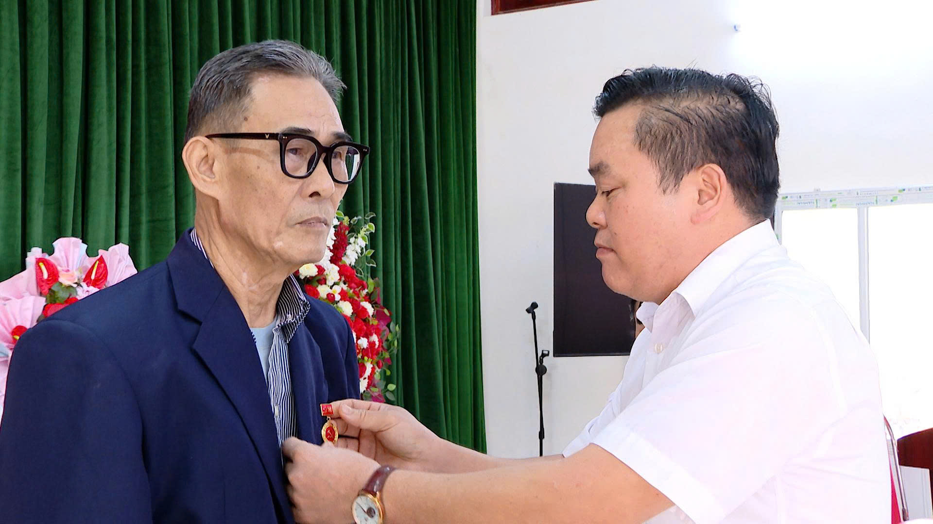 Đồng chí Ma Công Khâm, Phó Bí thư Đảng ủy, Chủ tịch UBND xã trao Huy hiệu 40 năm tuổi Đảng.