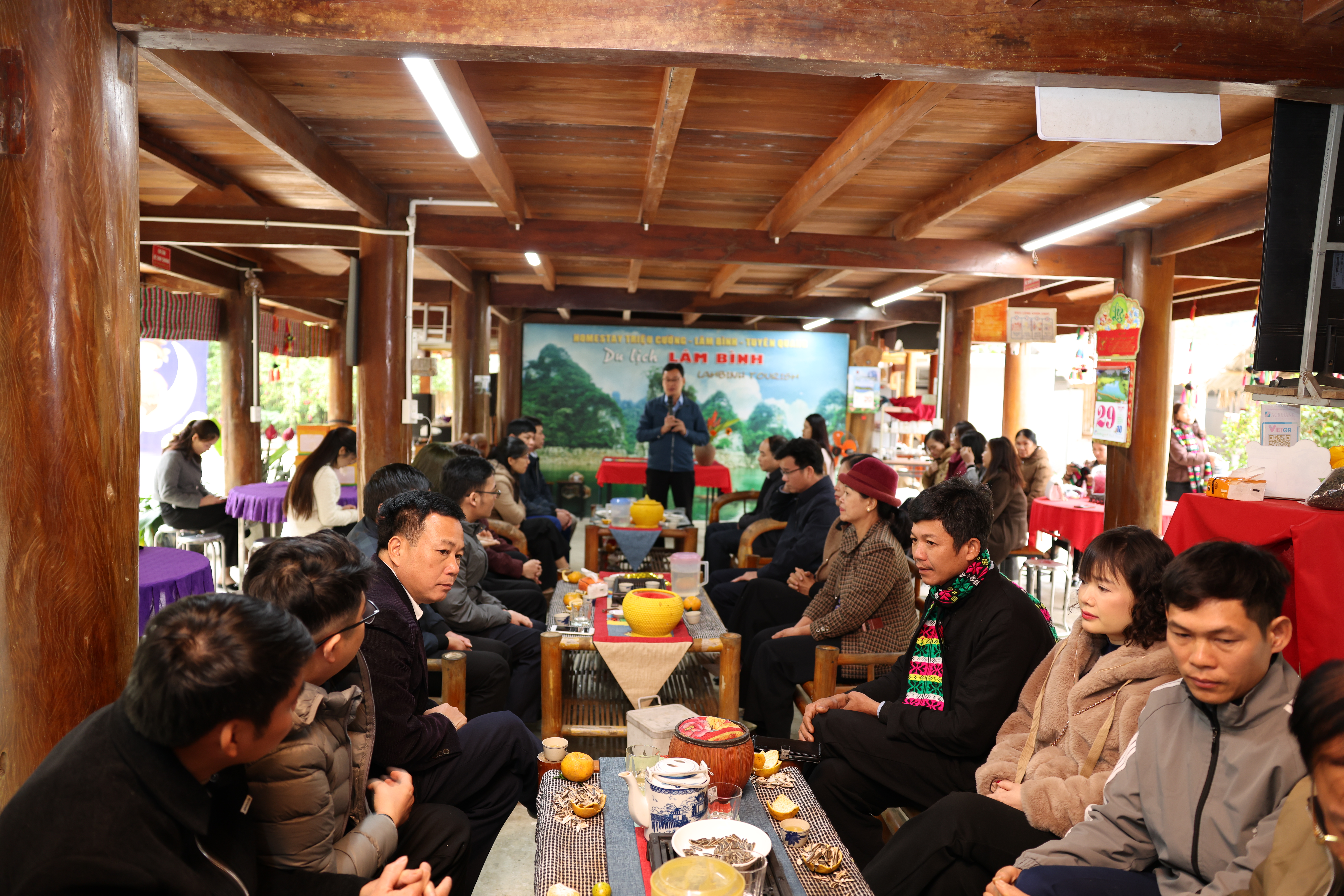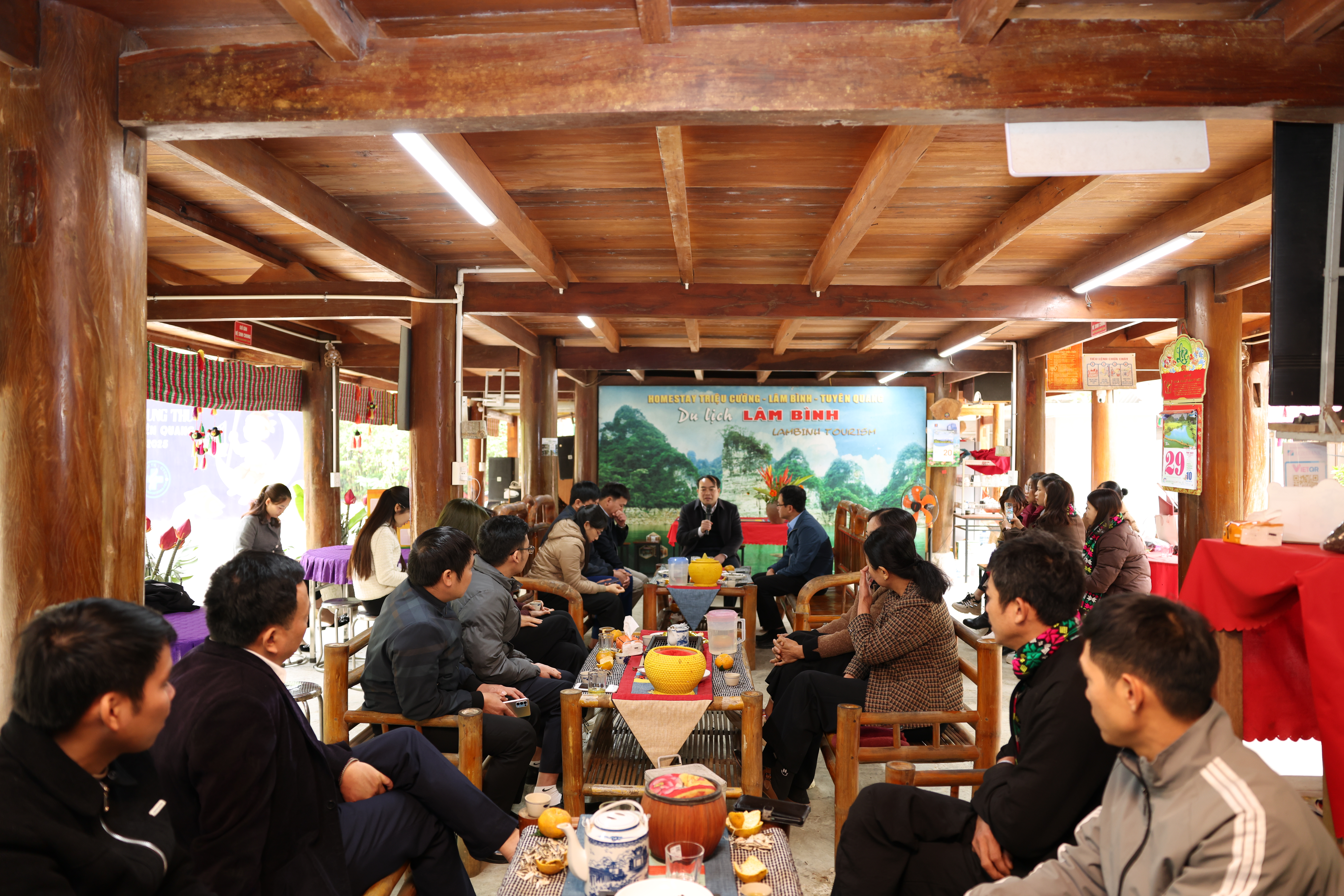 Tại buổi làm việc, lãnh đạo UBND 2 xã Thượng Lâm và xã Bạch Thông, tỉnh Thái Nguyên đã trao đổi, chia sẻ kinh nghiệm một số nét đặc trưng, nổi bật, những kết quả đạt được của 2 xã về phát triển kinh tế - xã hội, Quốc phòng – An ninh. Về công tác lãnh đạo, chỉ đạo, điều hành, phát huy tiềm năng, lợi thế địa phương trong phát triển kinh tế; Quy trình triển khai dự án, tiểu dự án của Chương trình mục tiêu quốc gia; Công tác huy động cộng đồng tham gia phát triển du lịch bền vững. Các mô hình phát triển kinh tế trên địa bàn xã Thượng Lâm và Đoàn công tác xã Bạch Thông, tỉnh Thái Nguyên đã tham quan mô hình làm du lịch công đồng Homestay thôn Nà Tông, tham quan HTX nuôi cá lồng Tùng Giang trên lòng hồ Na Hang – Lâm Bình.