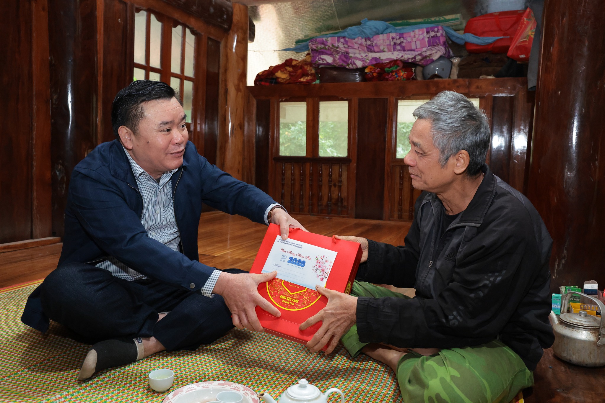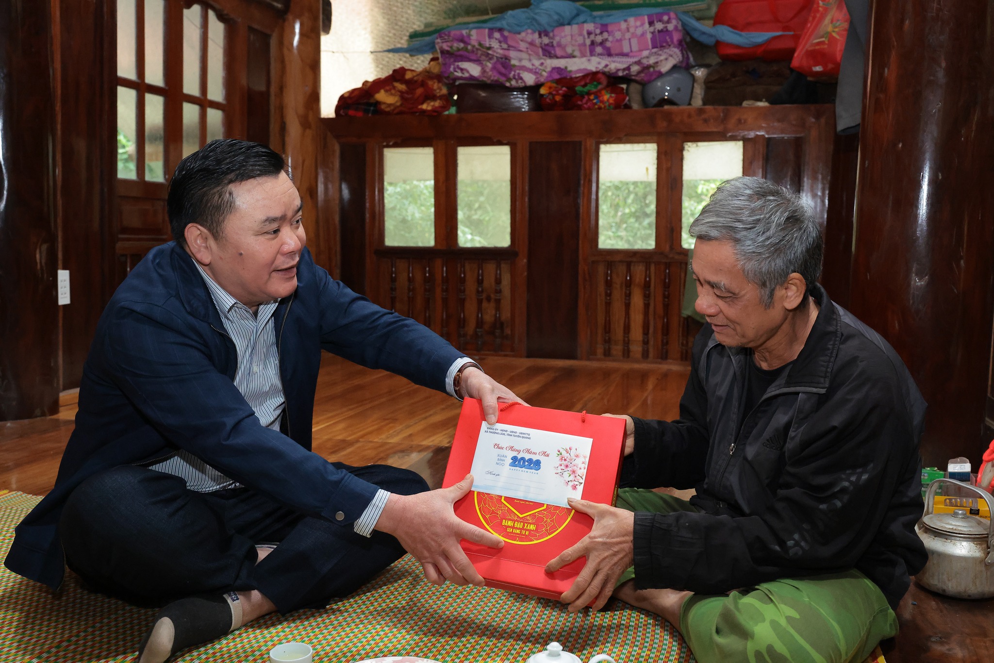 Đồng chí Quan Văn Phùng, Phó Bí thư Thường trực Đảng uỷ, Chủ tịch HĐND xã tặng quà cho ông Hoàng Văn Tự, Thương binh suy giảm KNLĐ 21%