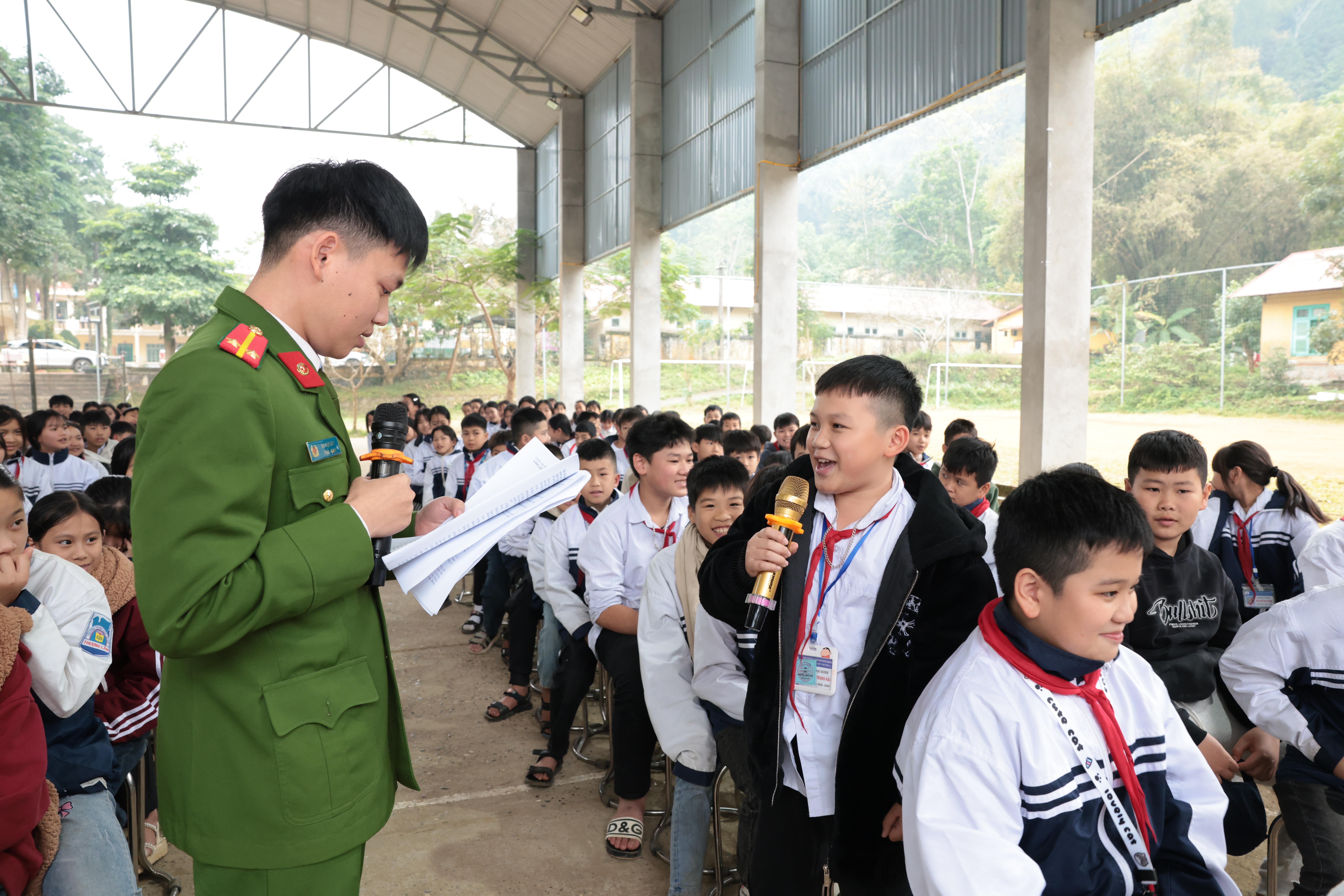Cán bộ Công an xã Thượng Lâm tuyên truyền, phổ biến cho các em học sinh