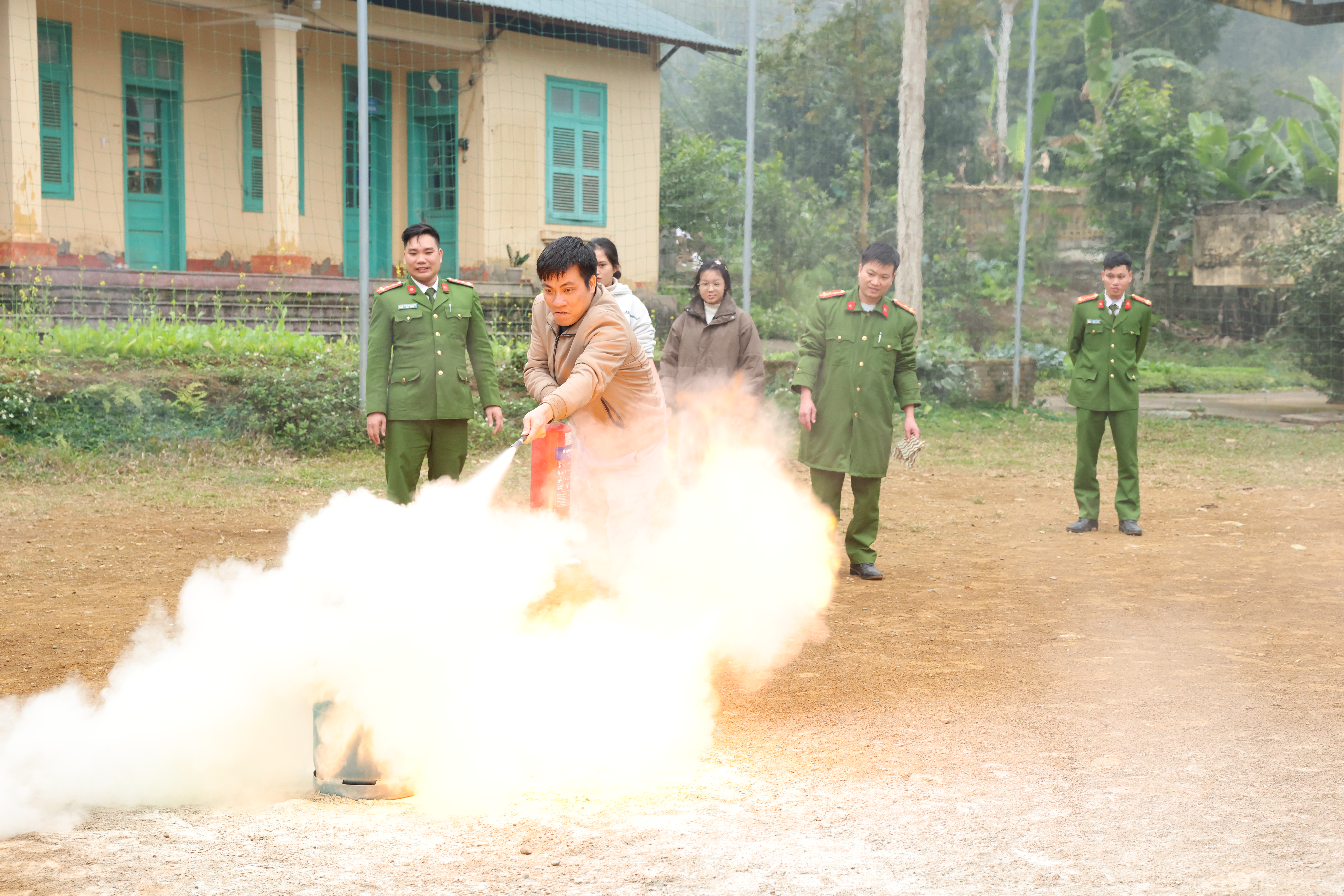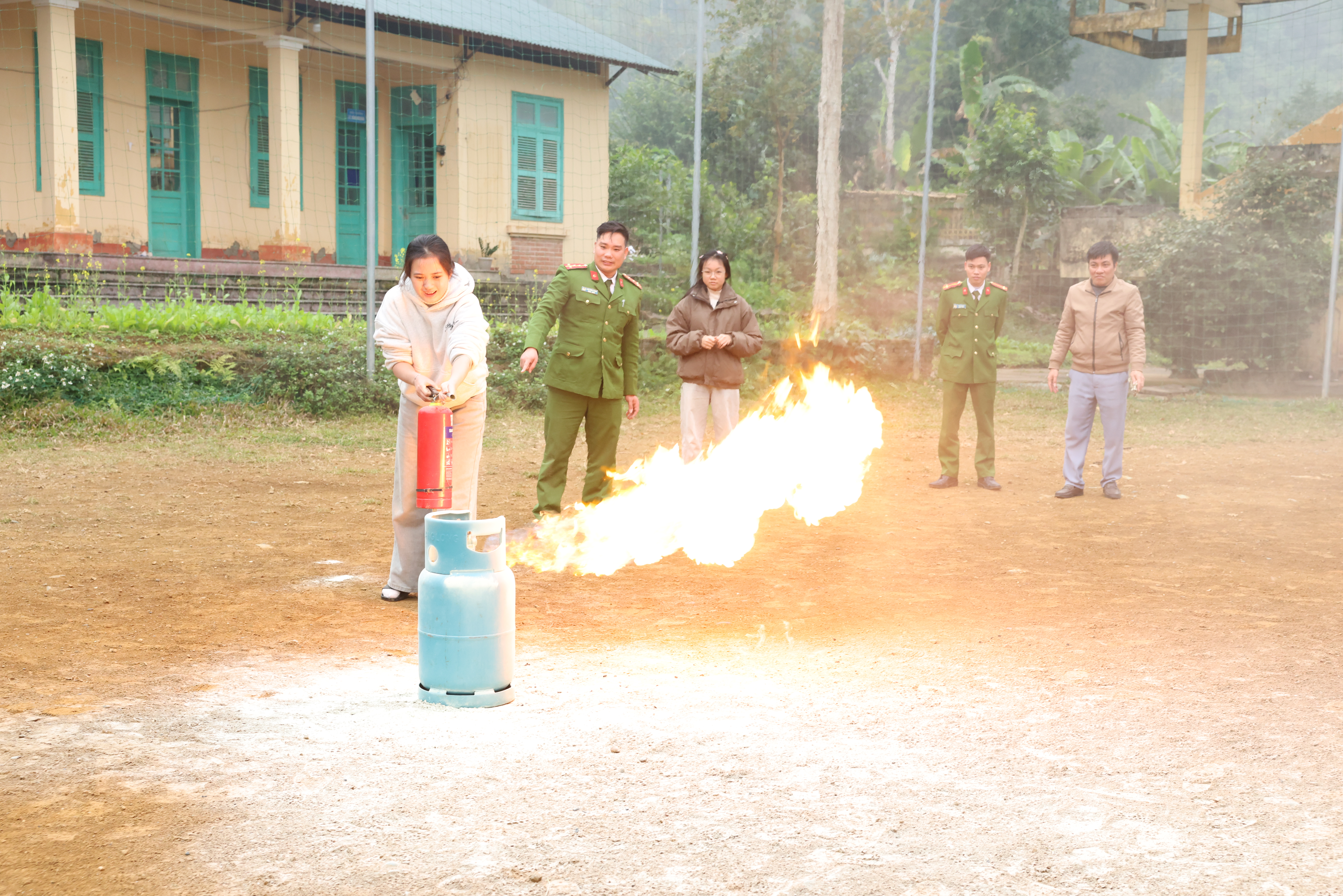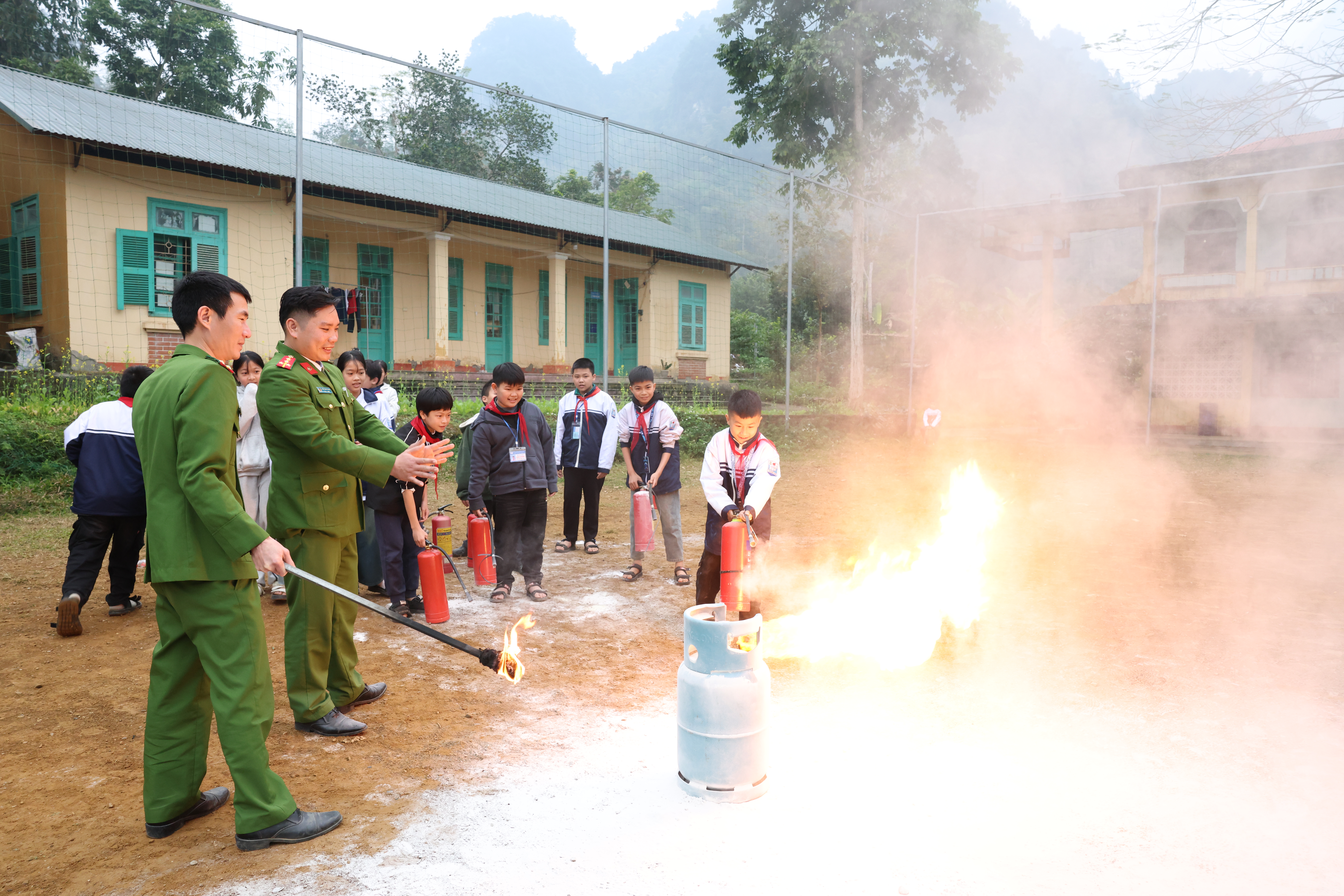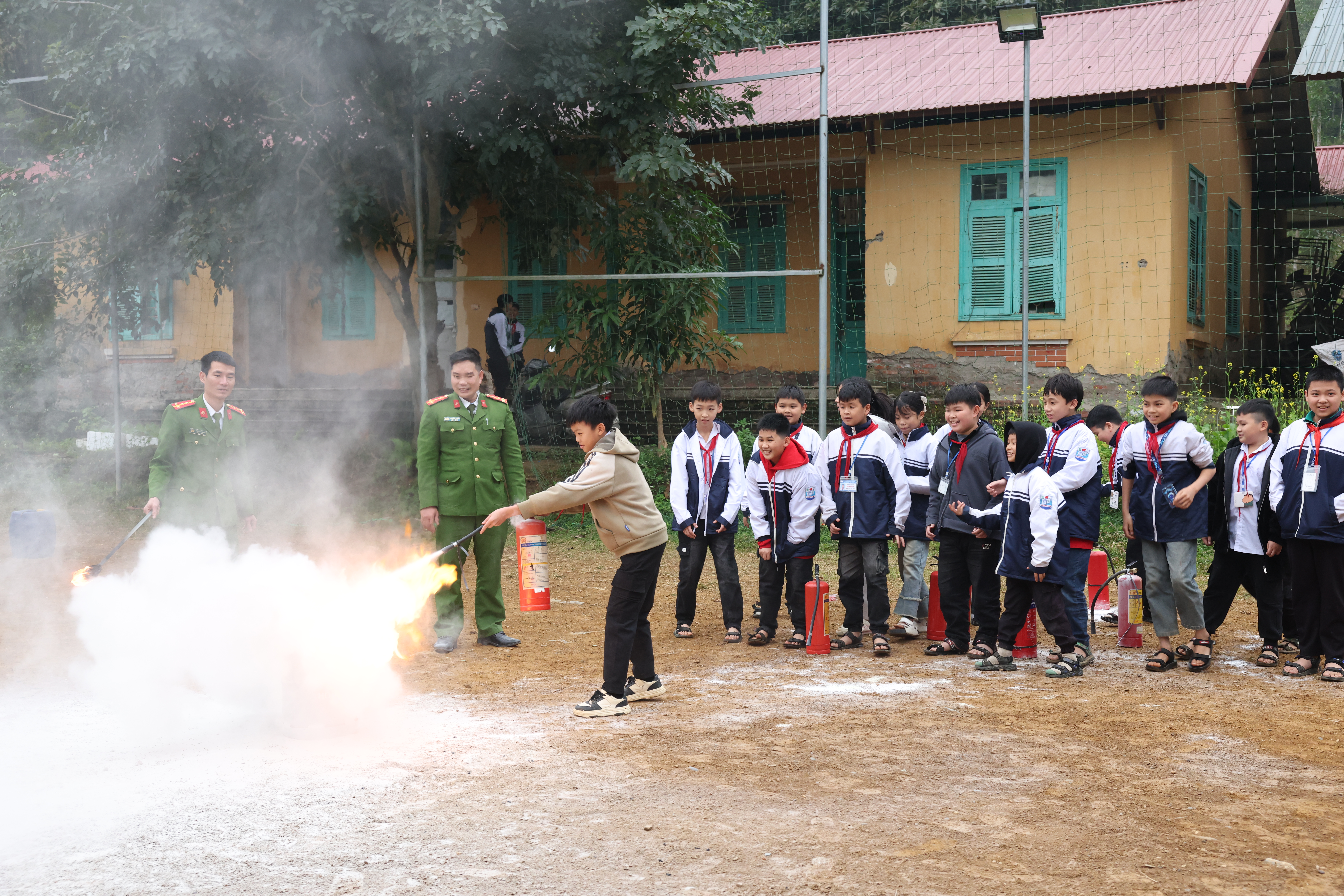 Các thầy cô giáo và các em học sinh được trực tiếp xử lý kỹ năng phòng cháy, chữa cháy