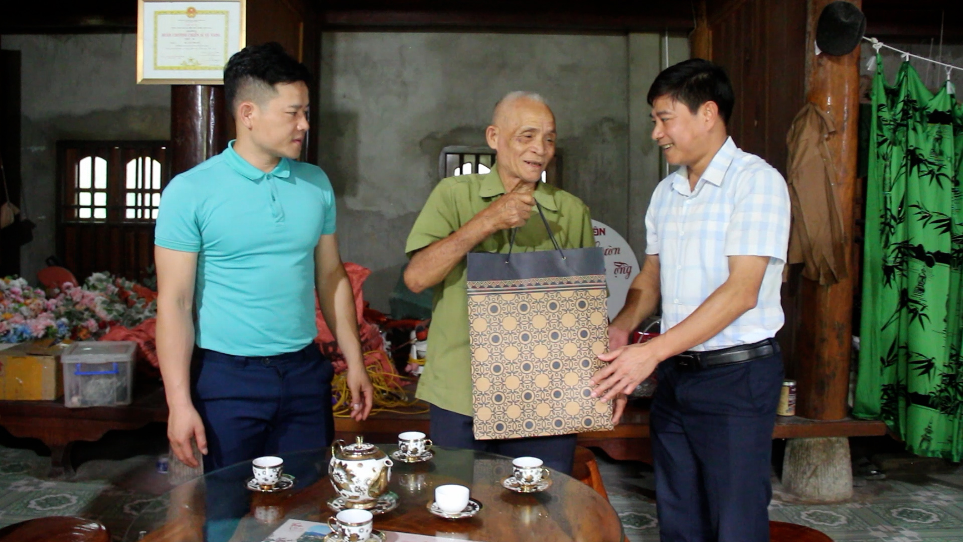 Đồng chí Nguyễn Văn Hòa, Bí thư Đảng ủy xã Thượng Lâm đã đến thăm hỏi, tặng ông Tề Văn Thuyết