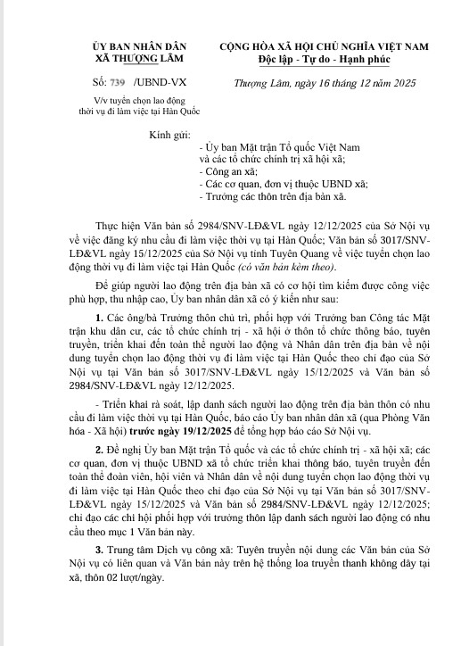 Thực hiện chỉ đạo của Sở Nội vụ tỉnh Tuyên Quang về việc tuyển chọn lao động thời vụ đi làm việc tại Hàn Quốc, Ủy ban nhân dân xã Thượng Lâm thông báo đến Nhân dân trên địa bàn xã như sau: