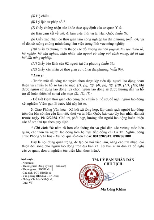 Mọi thông tin chi tiết, người lao động có thể liên hệ đồng chí La Thị Nghĩa – công chức Văn hóa – Xã hội xã, số điện thoại: 0912 202 947 hoặc 0387 361 881 để được hướng dẫn cụ thể.