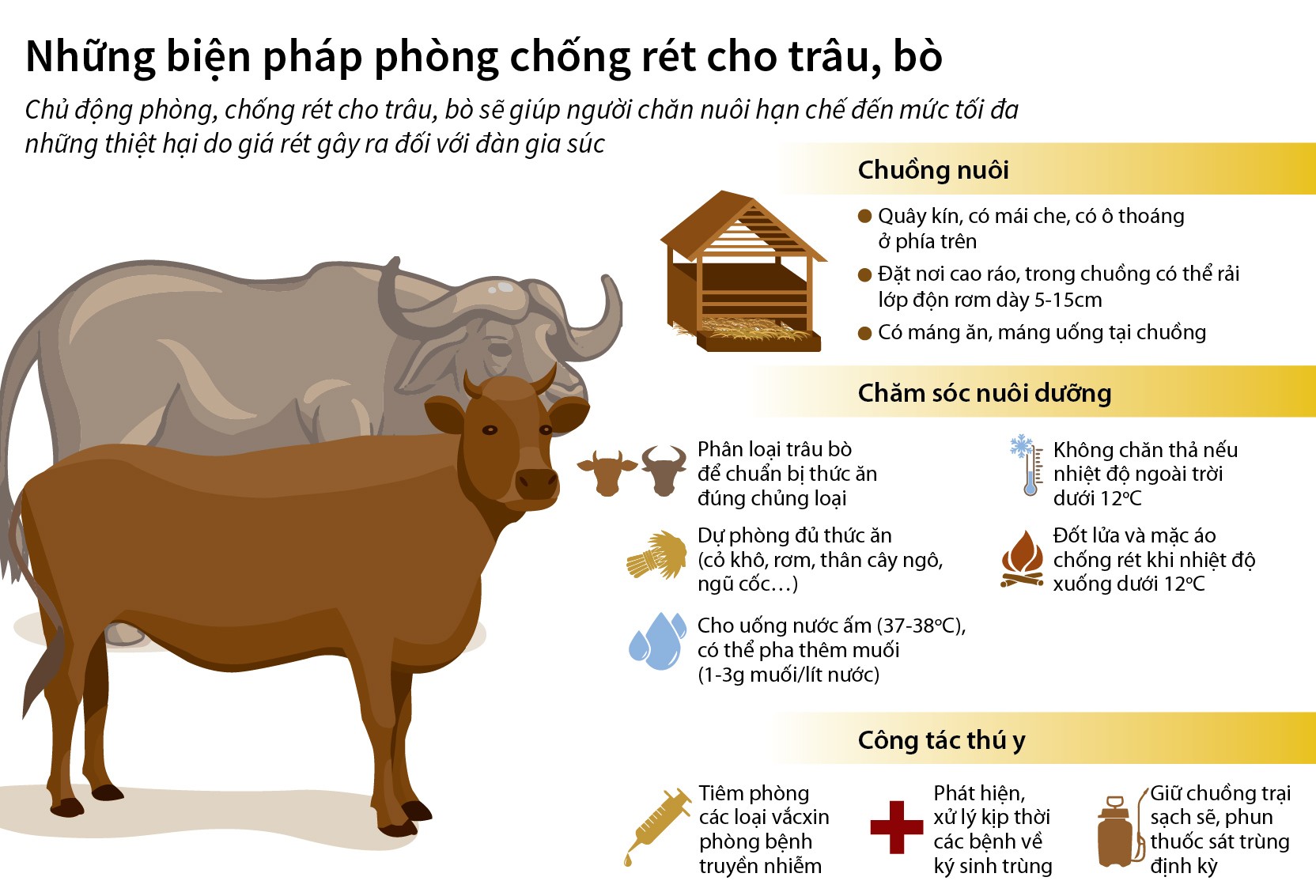 Cần gia cố, che chắn chuồng trại kín gió, khô ráo; lót nền bằng rơm rạ, trấu, thắp bóng đèn sưởi hoặc đệm lót sinh học, khoác bao tải, chăn cũ; đốt lửa sưởi ấm để giữ ấm (đảm bảo an toàn phòng cháy, chống ngạt). Không chăn thả gia súc, gia cầm ngoài trời khi xảy ra rét đậm, rét hại. Tăng cường chăm sóc, nuôi dưỡng; bổ sung thức ăn tinh, thức ăn giàu năng lượng; cho uống nước ấm, bổ sung muối khoáng, vitamin, điện giải để tăng sức đề kháng.