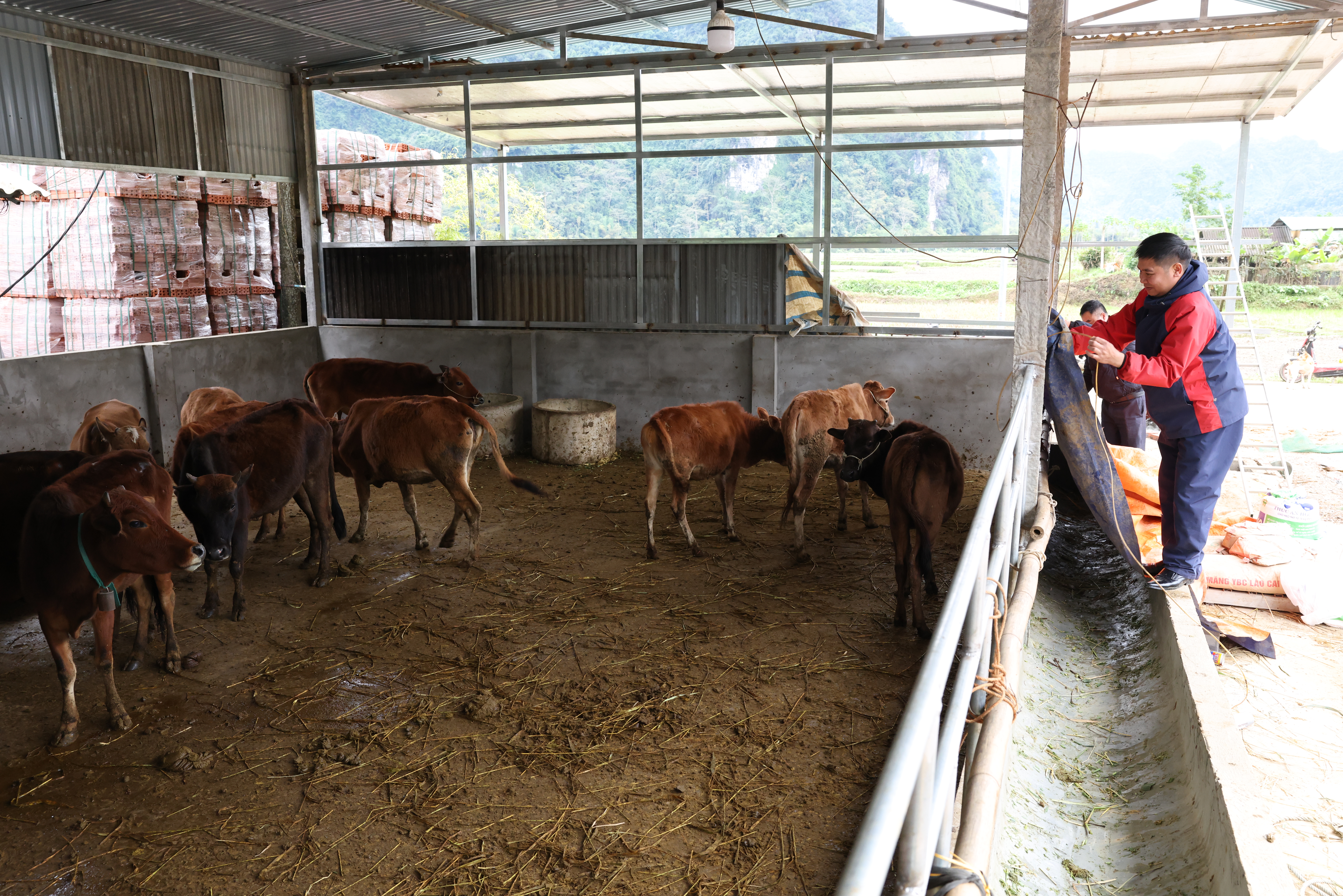 Cán bộ Trung tâm Dịch vụ công xã đến hướng dẫn người dân và giúp đỡ che chắn chuồng trại phòng chống rét cho đàn vật nuôi