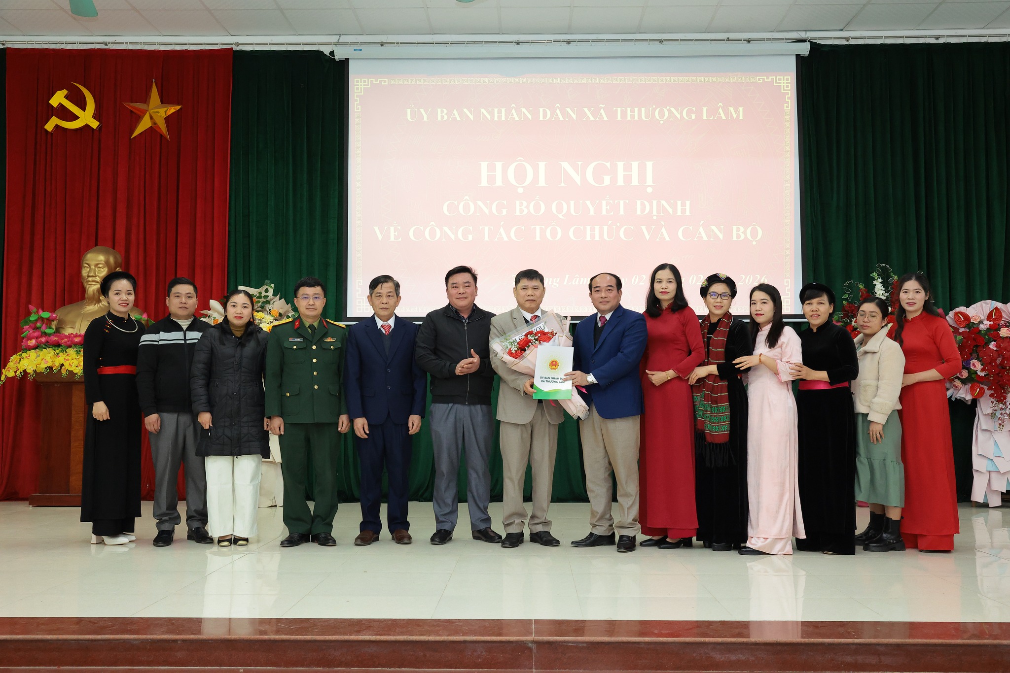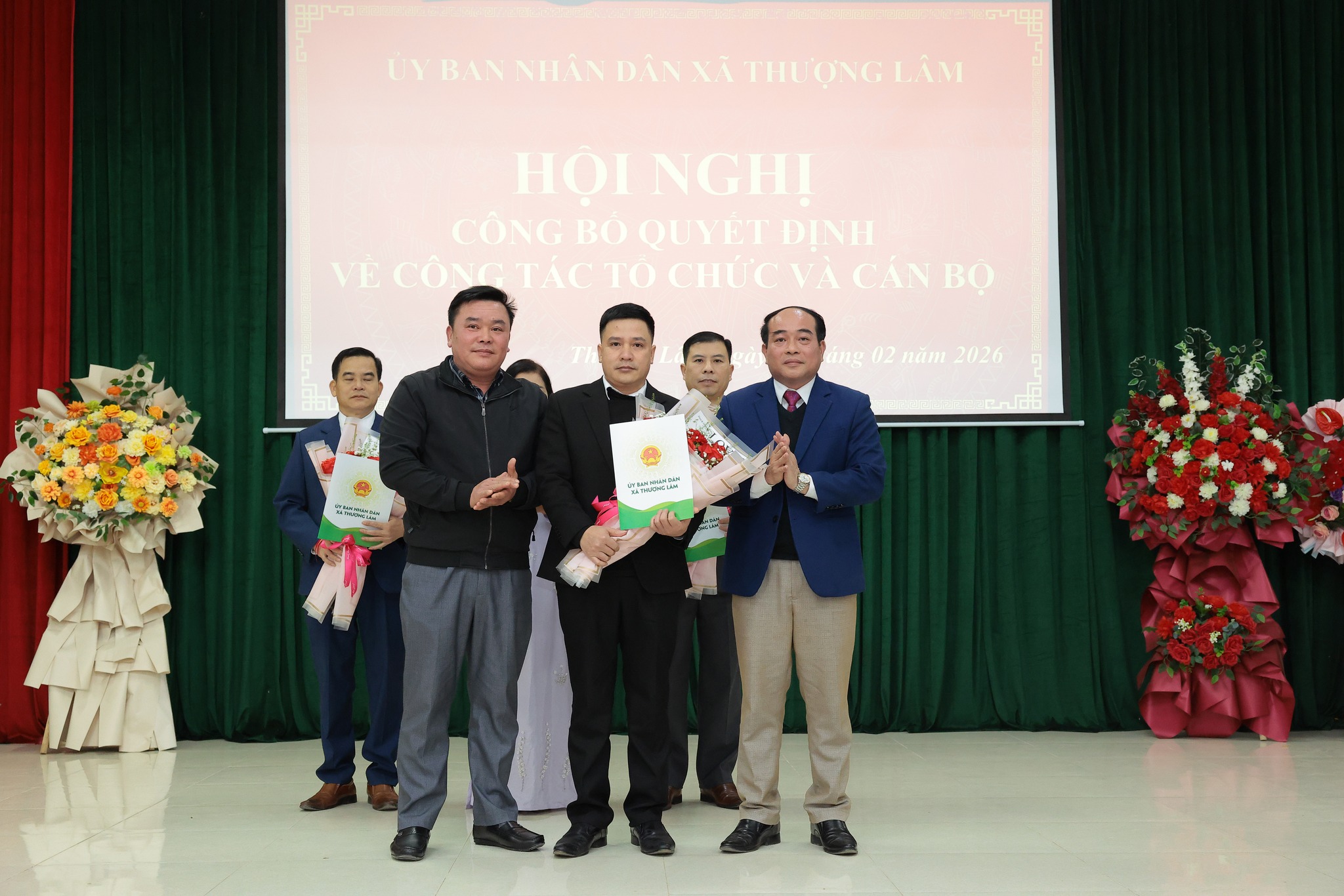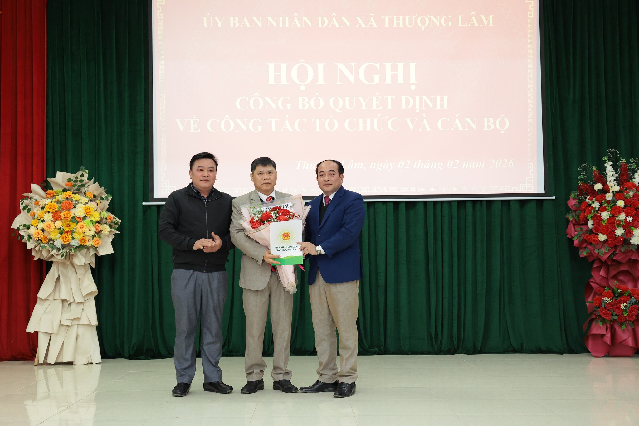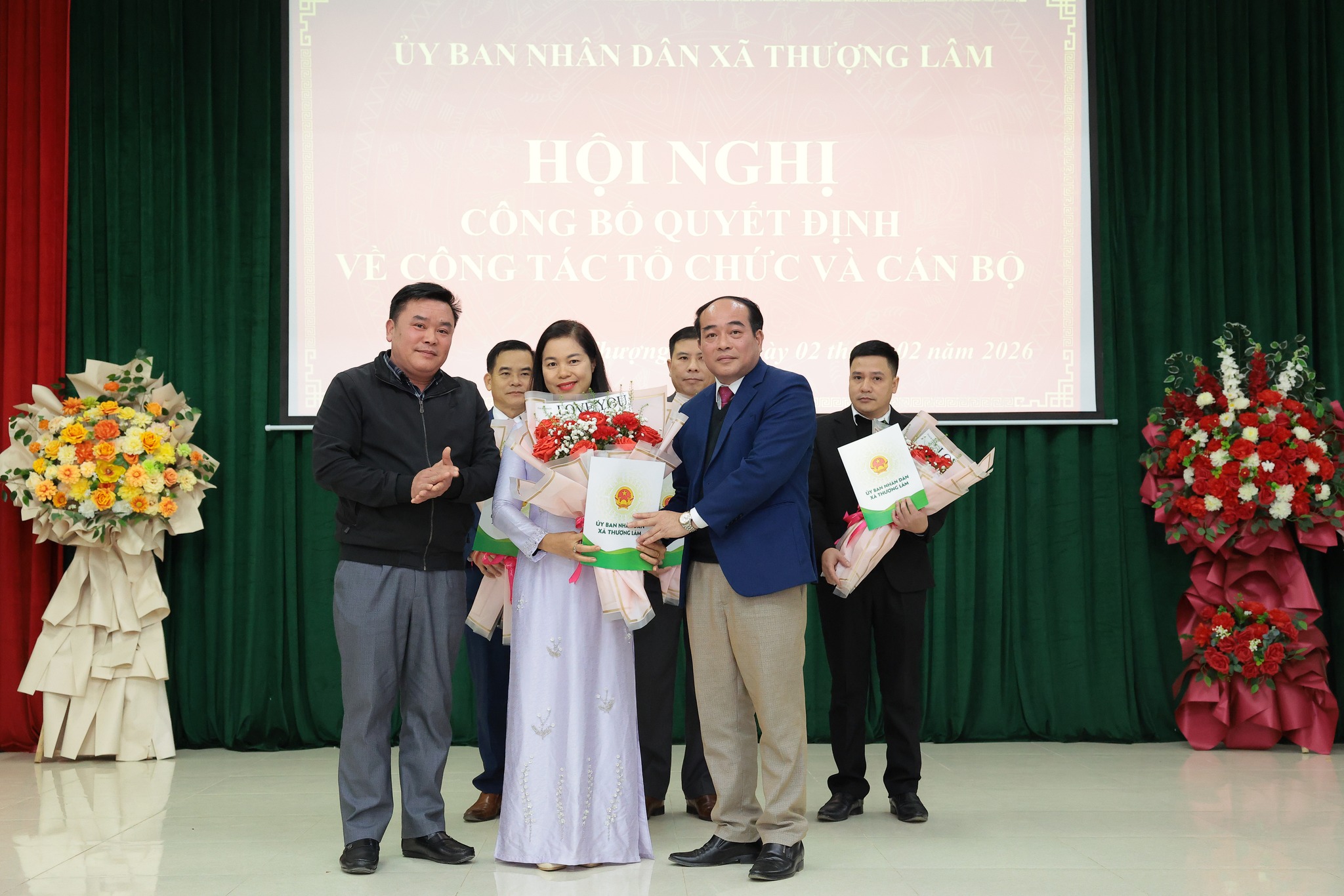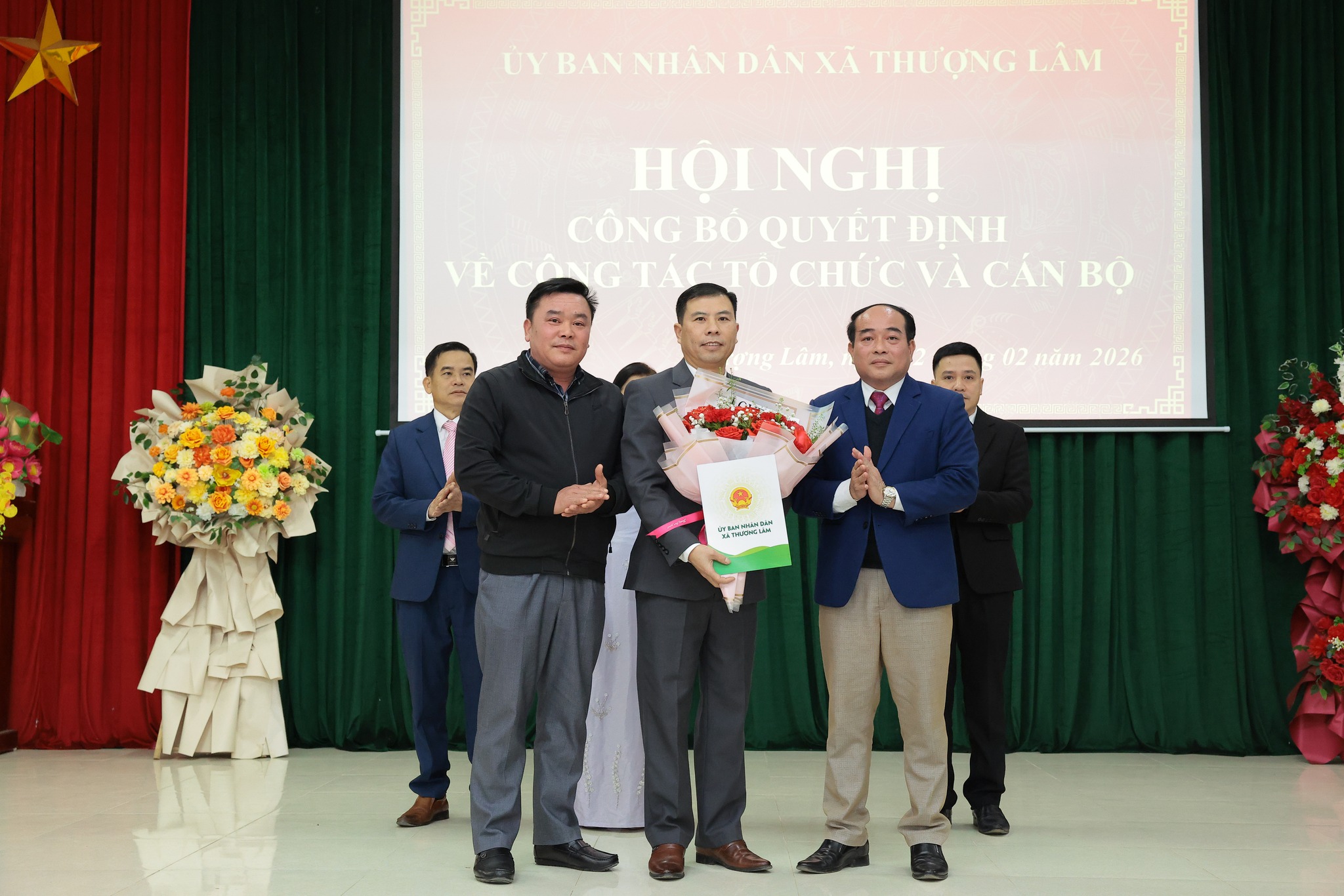 Các đồng chí lãnh đạo xã Trao quyết định và tặng hoa chúc mừng đồng chí Quan Thanh Huy, Giám đốc Trạm Y tế xã Thượng Lâm